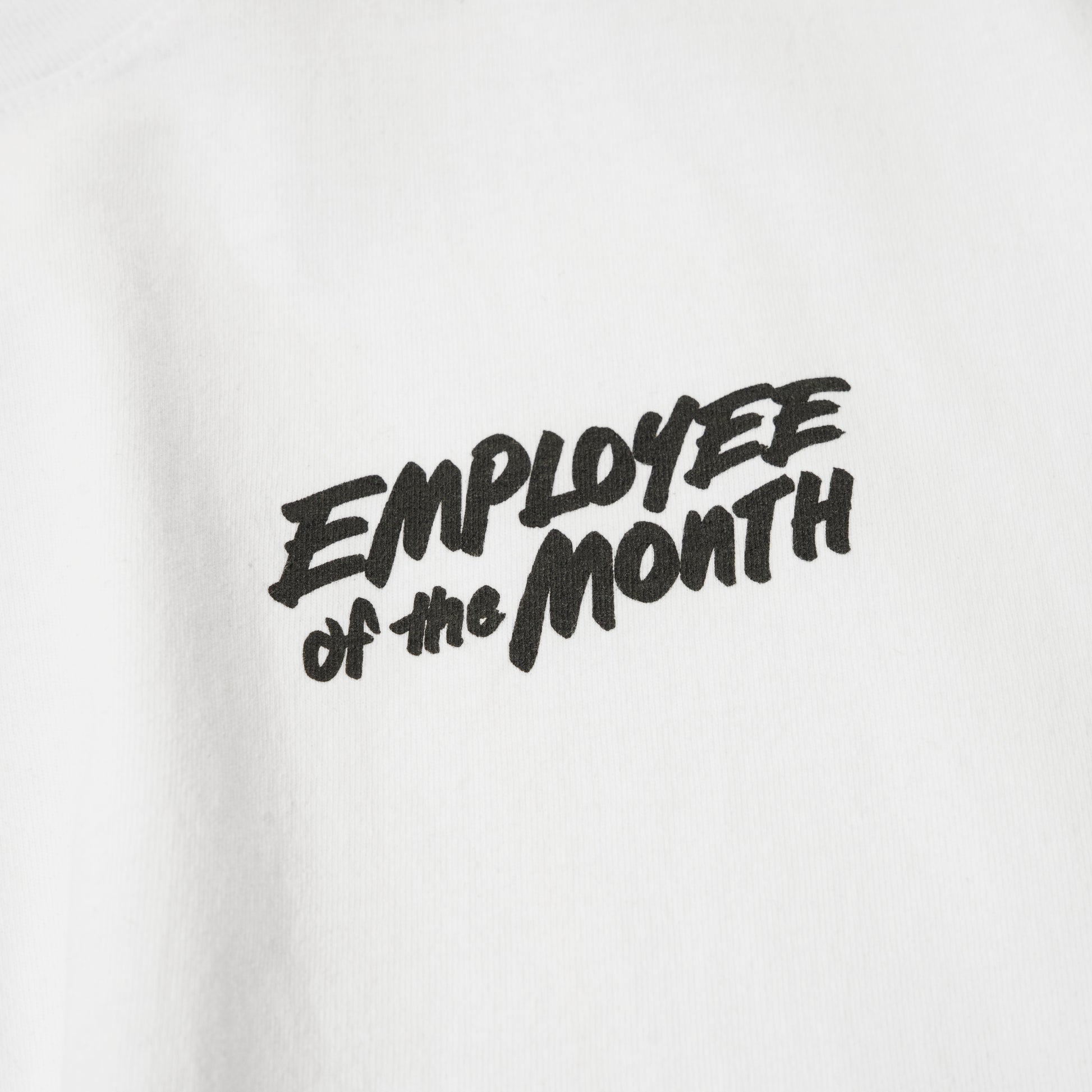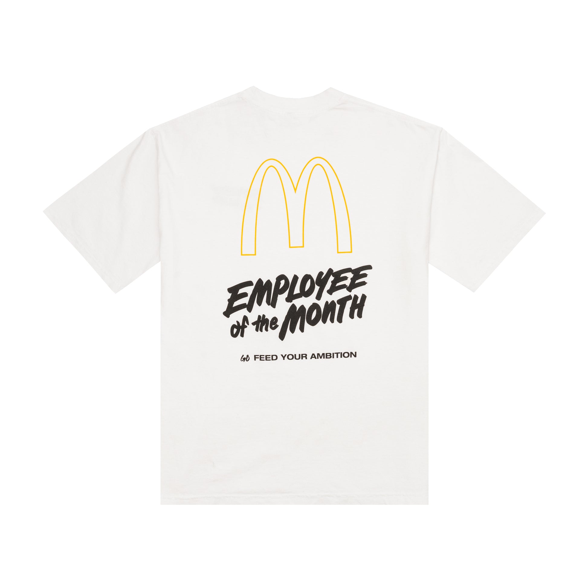 The Employee of the Month Tee features the EOTM typeface lock-up on the left chest and the classic McDonald’s arch logo, EOTM typeface lock-up with “GO Feed Your Ambition” on the back.